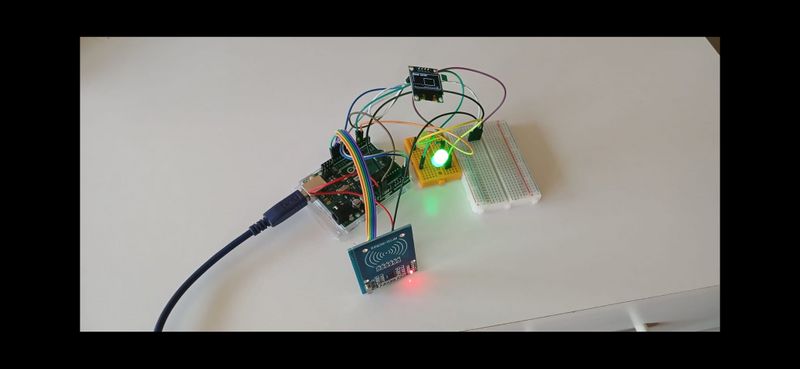 Ici, on a brancher des led, un capteur RFID, qui permet de lire des badges et des cartes magnétiques et un écran OLED, c'est à dire un petit écran sur lequel on va pouvoir afficher du texte ou différentes figures (rectangles, lignes, etc.). Ce qu'on va afficher sur cet écran est également prévu dans le programme Arduino que l'on va transférer à la carte.